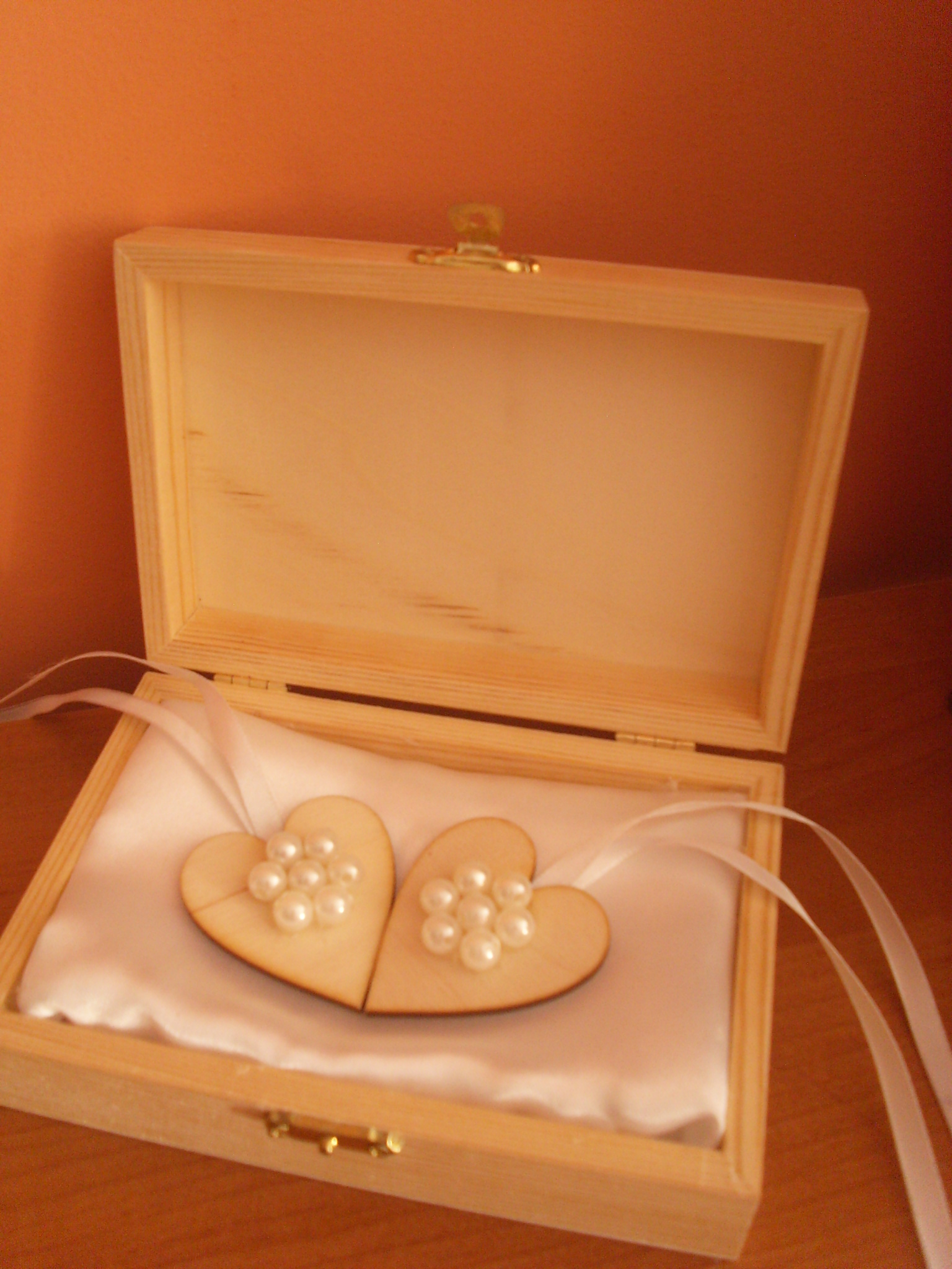 Szívalakú, virágokkal díszített fa gyűrűtartó, melybe a pár neve égetve van.