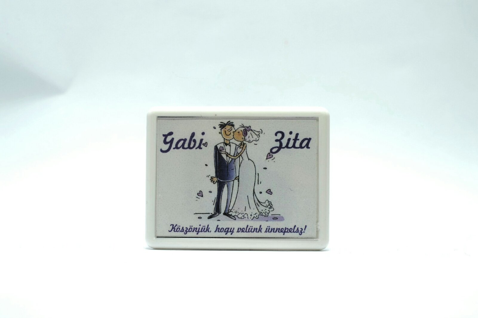 A felirat bármilyen színben kérhető. A hűtőmágneshez fehér műanyag keret tartozik.