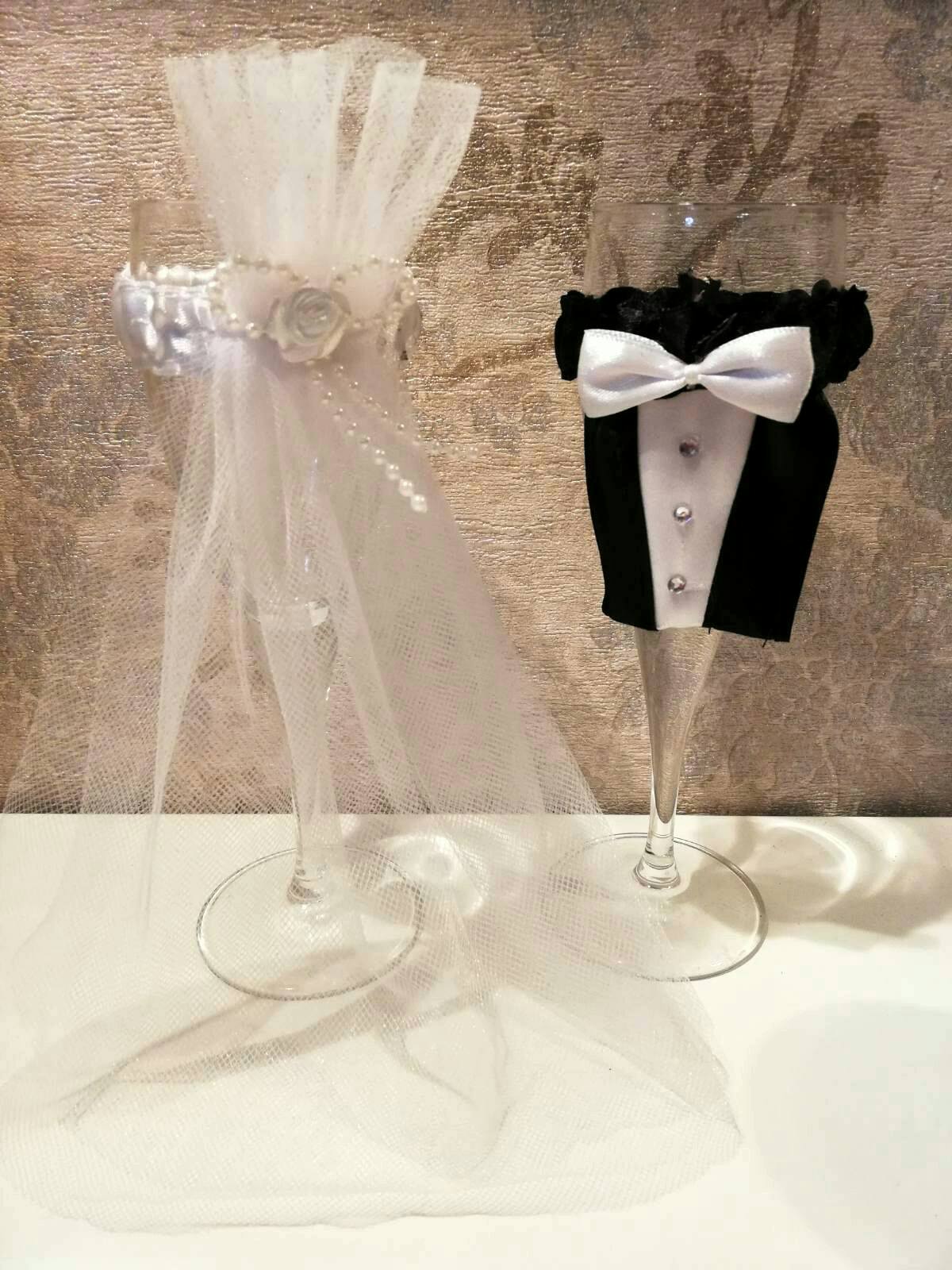 Menyasszony-vőlegény ruha pezsgős pohárra
