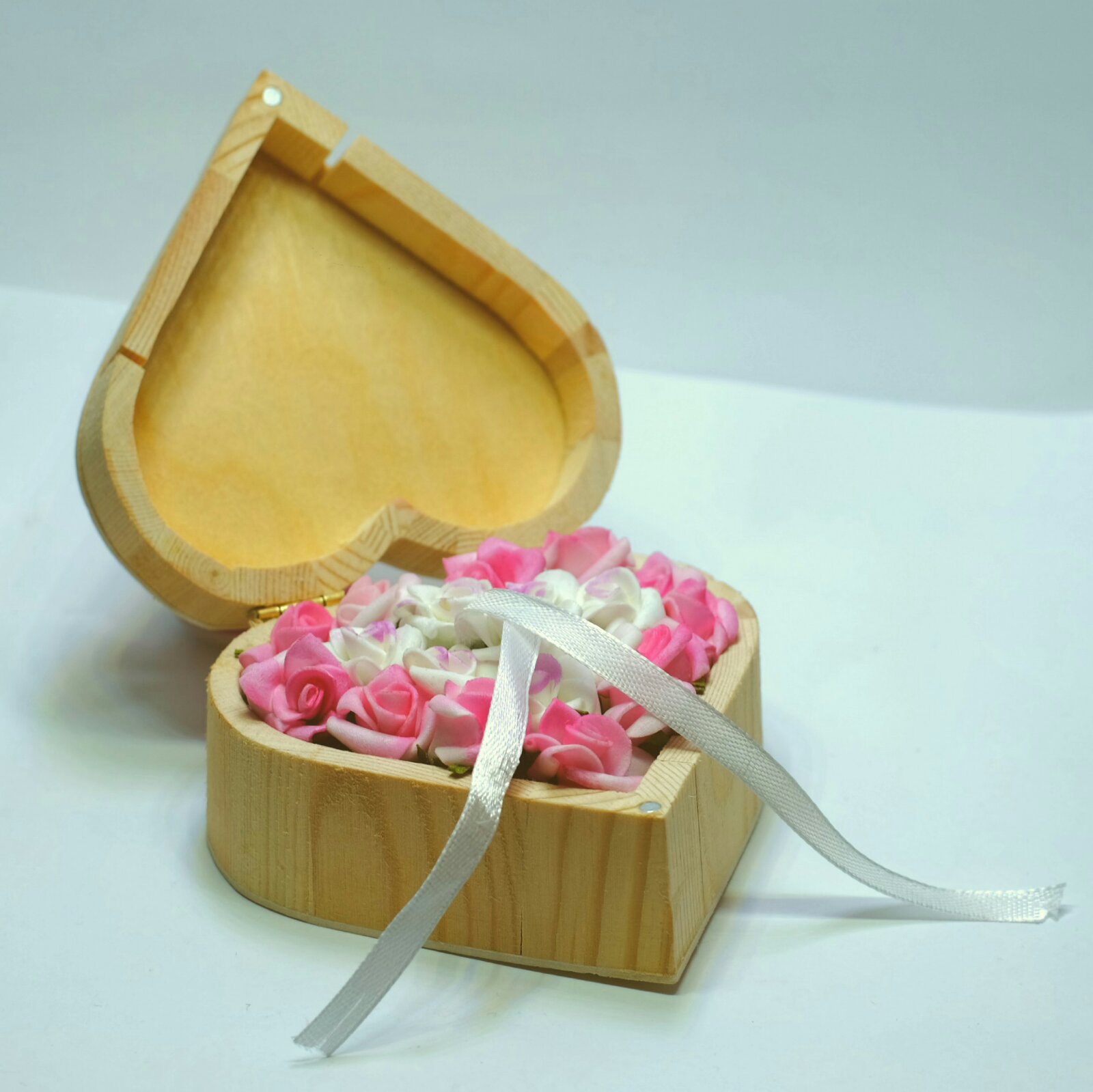 Szívalakú, virágokkal díszített fa gyűrűtartó, melybe a pár neve égetve van.