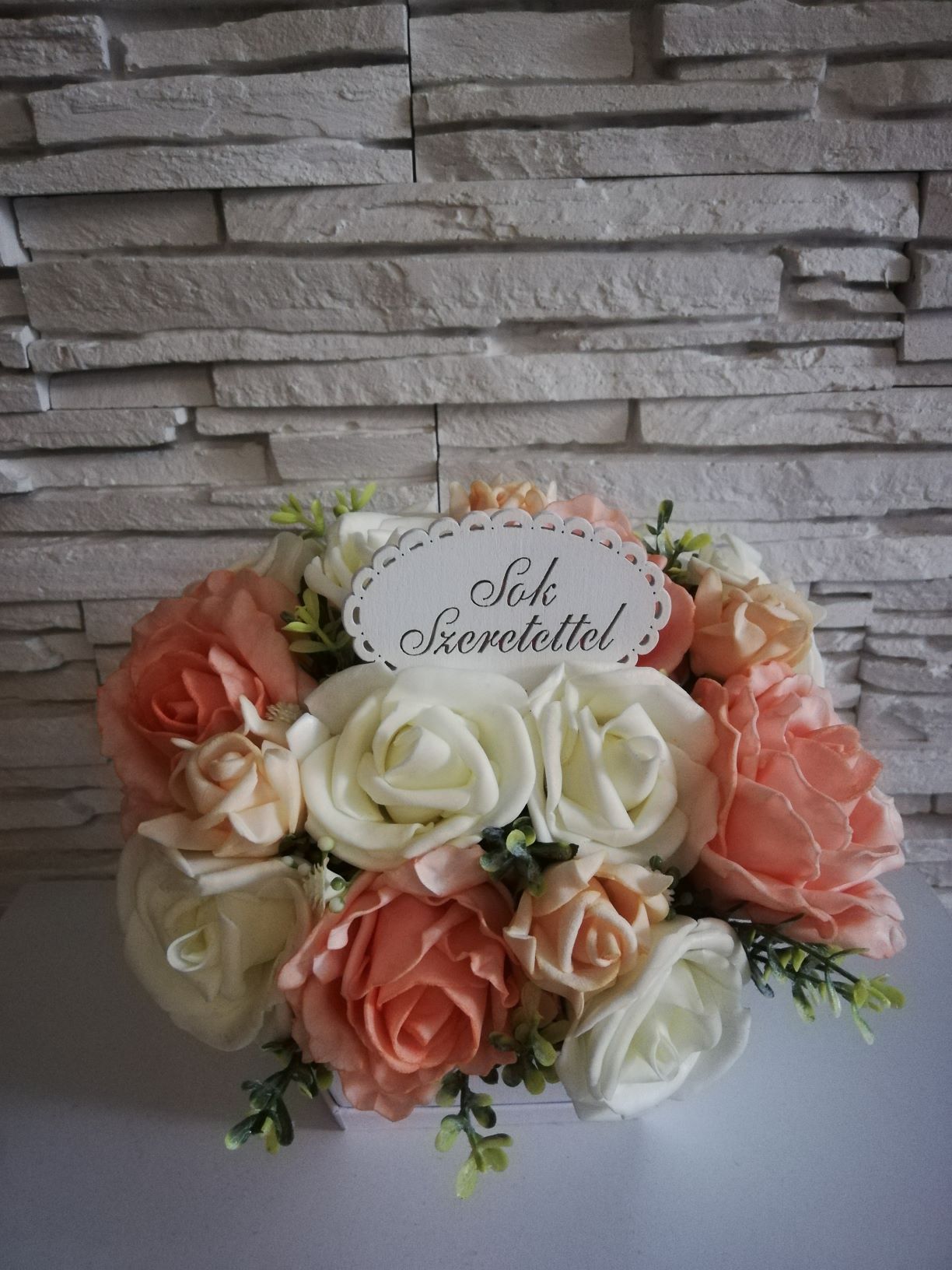 Virágbox hatszög alakú dobozban barack színvilágban örömanyák részére.