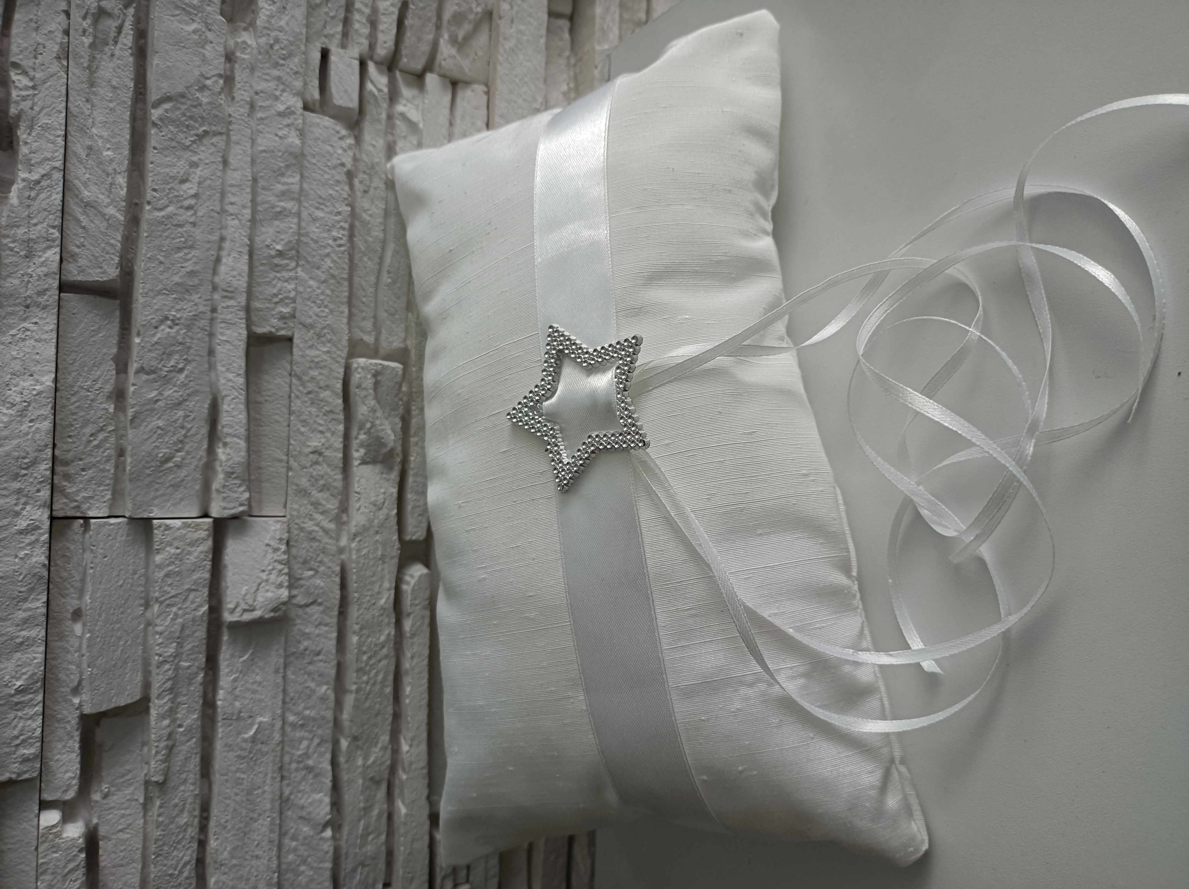 Gyűrűtartó doboz csipke és virág dekorációval, a pár nevével.
