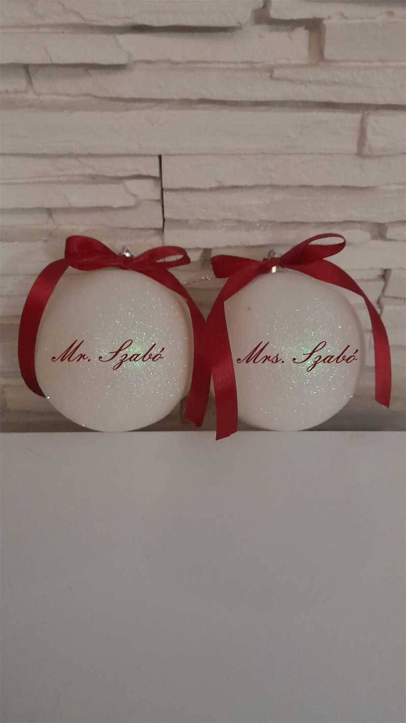 Egyedi felirattal, névvel ellátott karácsonyfagömb, csillámos fehér szinű. 14 cm átméröjű. Arany, ezüst, kék, rózsaszin, bordó felirattal kérhető.