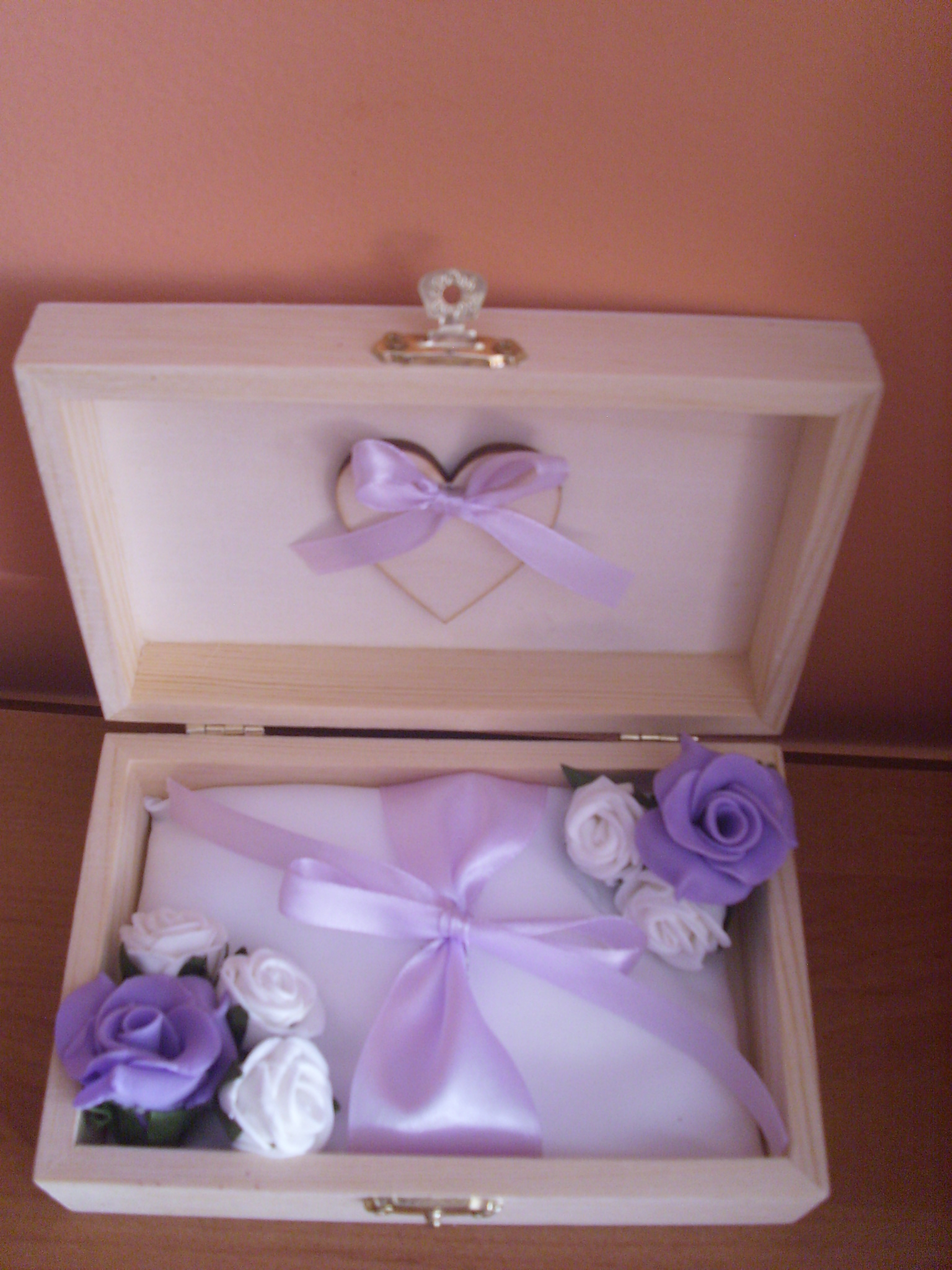 Szívalakú, virágokkal díszített fa gyűrűtartó, melybe a pár neve égetve van.